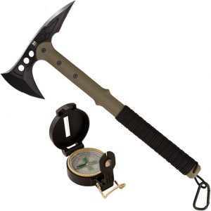 M48 Tactical Tomahawk Military Axe – Green/Black with Compass & Sheath | 3 ⅞” Cast Stainless Steel Axe | Piercing Spike | Nylon Cord Wrapped Fiberglass Handle | Camping and Tactical Gear | 15” Length