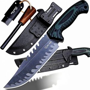 BA-KOR 12.4in Full Tang Fixed Blade Hunting Knife – 6mm 9CR18MoV Steel, G10 Handle, Stonewashed Sawback Blade with Kydex Sheath & Fire Starter for Outdoor, Camping, Survival (Green and black stripes)