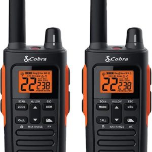 Cobra RX680 Walkie Talkies (2-Pack) – Rugged & Splashproof Two Way Radios Long Range, IP54 Water Resistant Design, 60 Pre-Programmed Channels, Weather Alerts, Included Charging Dock (Black/Orange)