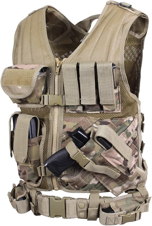 - Left side features: pistol holster capable of carrying most medium sized handguns, 3 pistol magazine pouches